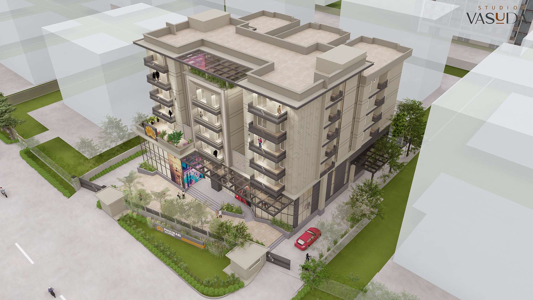 The façade design has proper allotted for branding as the building has two commercial floors. The facade has minimalistic aesthetics with clean lines and a neutral colour palette.