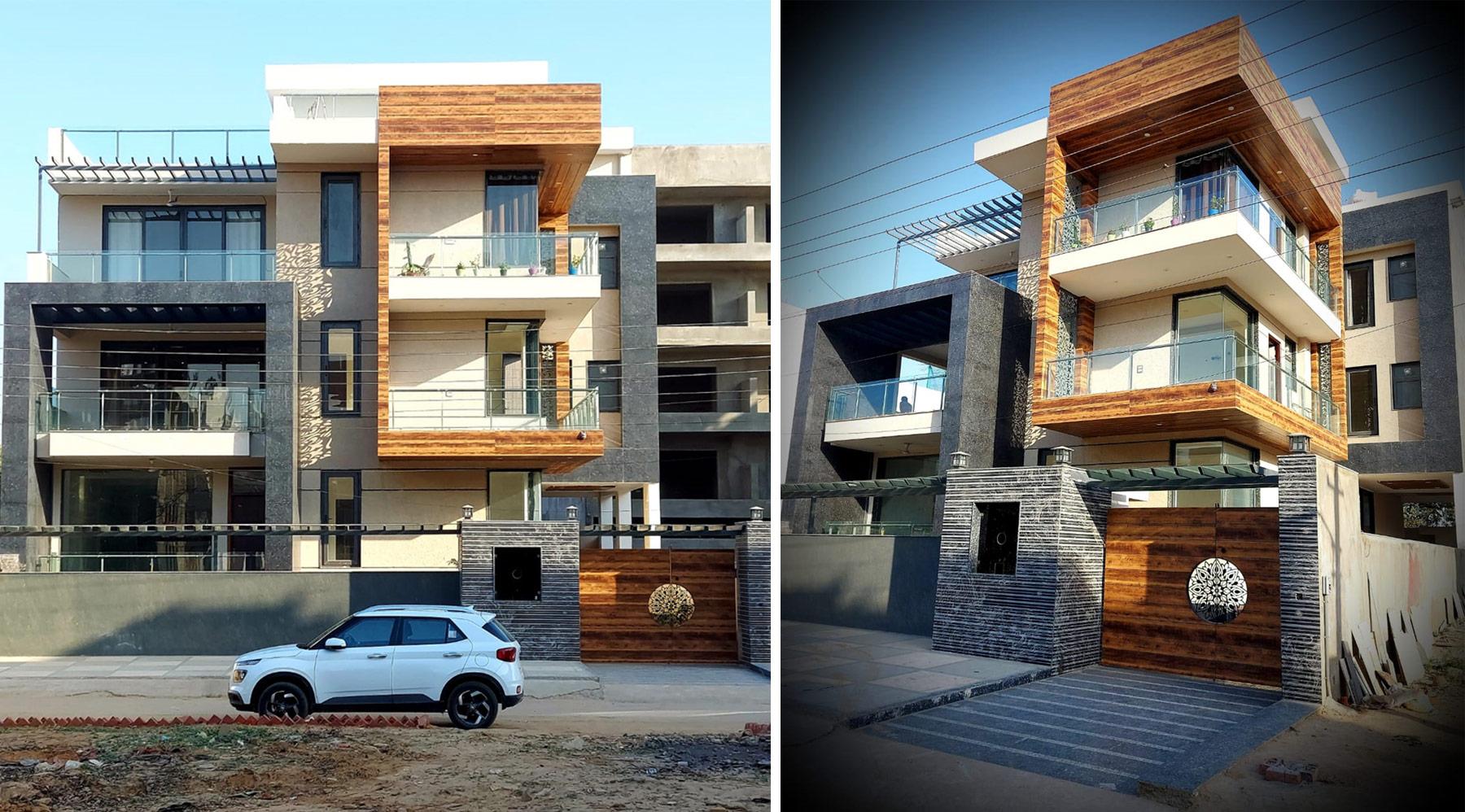 A home should tell the story of who you are and the design exactly reveals it. A residence design on a 450 sq mt plot with an approx built-up area of 14000 sq ft divided into a basement, ground, first and second floor. The servant rooms for all the floors are placed on the terrace. The basement and ground floor forms a duplex whereas the first and the second floor are planned as individual units.