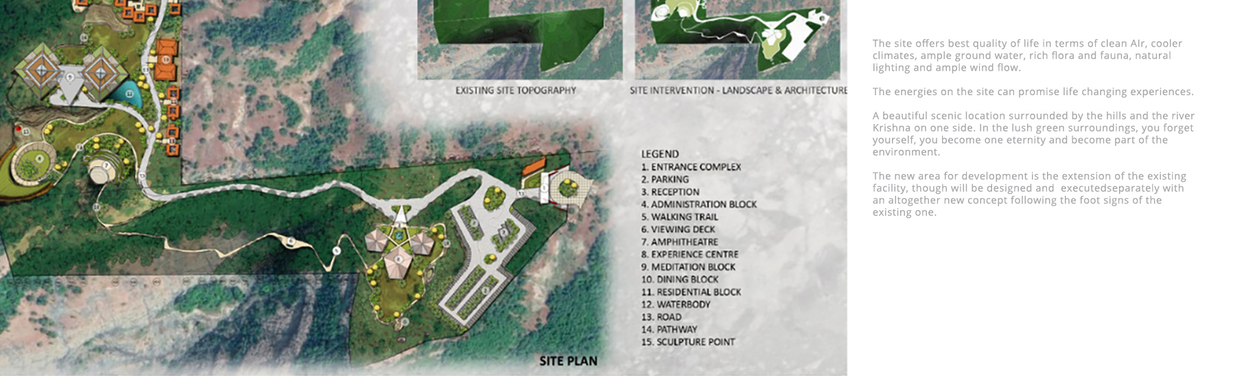 An attempt has been made to create an interactive interface with the external environment and has evolved from a rectangular plan with a Glass Pyramid roof. The pyramidical structure as Meditation Center is is considered as the shape with the 51 degree angle, is like store house of energy, which absorbs and radiates, giving a sense of hope to life. The deign attempts a seamless integratio of the play of light, form and the surrounding greenery.