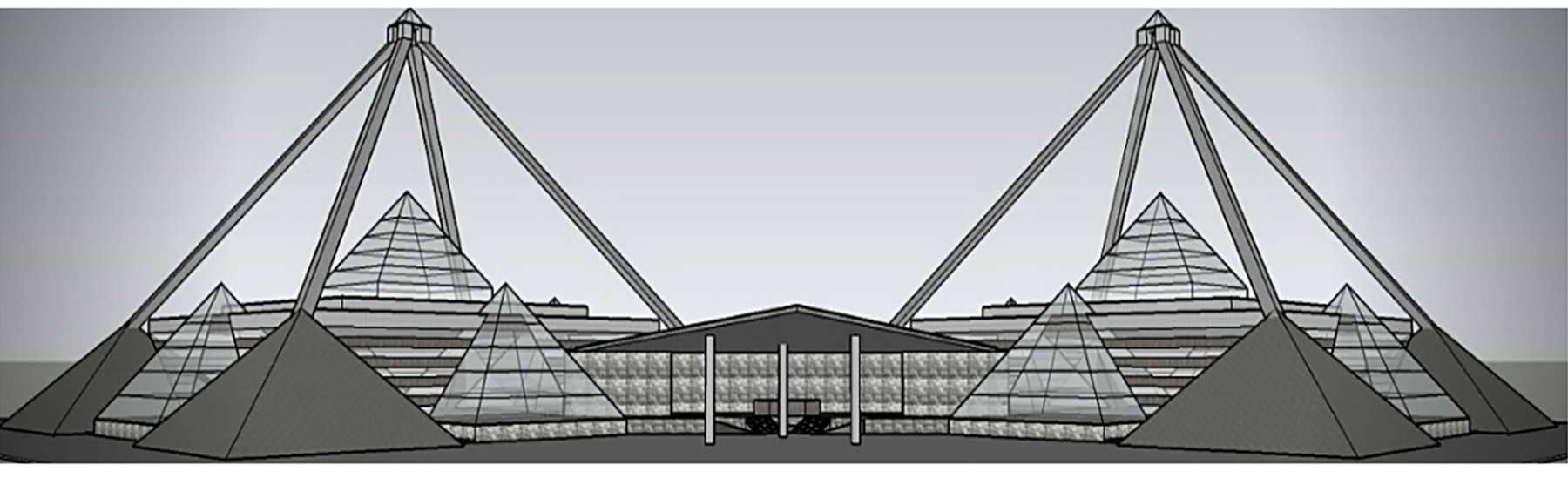 Meditation halls are in the shape of pyramids with golden ratio which denotes a connection between earth and sky.